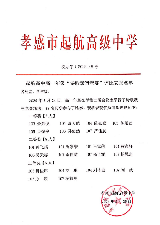 2024年4月26日關于頒發(fā)高一年級古詩文默寫比賽表彰的決定